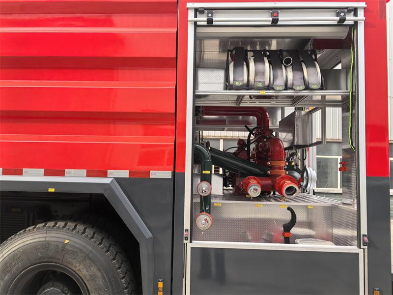 Das Beiben 2638 6x4 Feuerwehrfahrzeug ist mit einem Weichai WP10.380E32 Motor und einem FAST 12JS160T Getriebe ausgestattet. Im vorderen Bereich der Ladefläche befindet sich ein Geräteraum mit rutschfesten, strukturierten Wänden aus Aluminiumlegierung zur Aufbewahrung verschiedener Ausrüstungsgegenstände. Im mittleren Bereich sind ein 10 m³ fassender Wassertank aus Kohlenstoffstahl und ein 2 m³ fassender Schaummitteltank untergebracht. Der hintere Pumpenraum ist mit einer CB10/60-RS Feuerlöschpumpe, einem Bedienfeld, Feuerwehrschläuchen und Werkzeugen wie einem Wassersammler, Strahlrohren und Schaumpistolen ausgestattet. Auf dem Dach der Ladefläche ist ein PL8/48 Feuerlöschmonitor montiert.