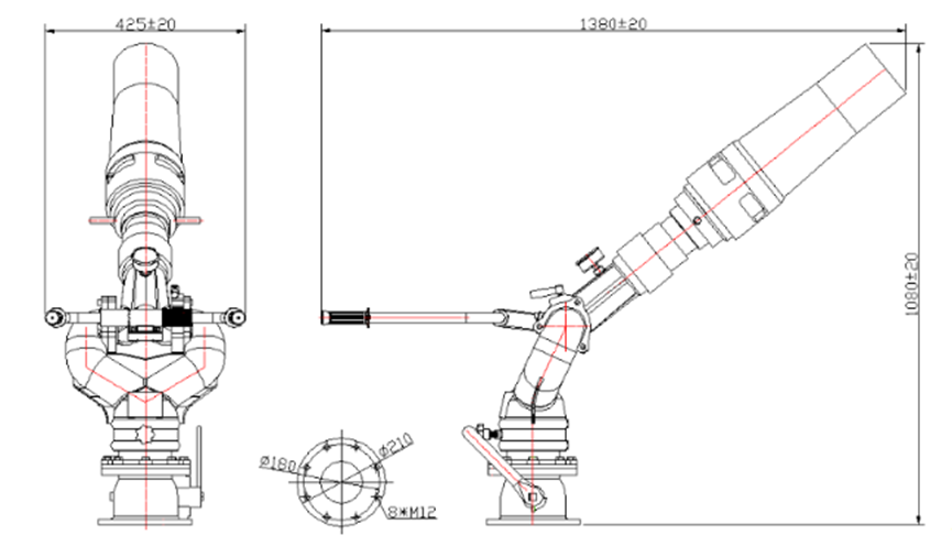 | Feuermonitor-Modell | Fließen | Reichweite | Nenndruck | Nickrotation | Horizontale Drehung | Gewicht |