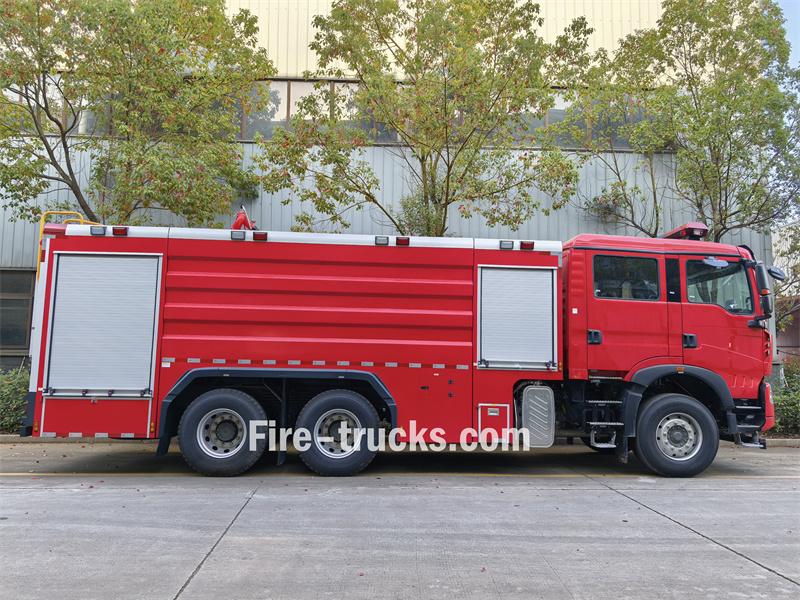 Das Howo TX460 6x4 12 m³ Schaumlöschfahrzeug basiert auf einem Sinotruk TX 6x4-Fahrerhaus mit einem Radstand von 4600 + 1400 mm und ist mit einem SINOTRUK MC11.46-61-Motor und einem HW19710-Getriebe ausgestattet. Im vorderen Teil des Aufbaus befindet sich ein Geräteraum zur Aufbewahrung verschiedener Feuerwehrausrüstung, während der mittlere Teil einen 9 m³ großen Wassertank aus Kohlenstoffstahl und einen 3 m³ großen Schaummitteltank beherbergt. Im hinteren Teil ist der Pumpenraum untergebracht, der mit einer CB10/60-RS-Feuerlöschpumpe, einem Bedienfeld und weiterer Feuerwehrausrüstung ausgestattet ist. Die Wasser- und Schaummitteltanks auf dem Dach verfügen über Mannlöcher; außerdem ist ein PL8/48-Löschmonitor vorhanden.