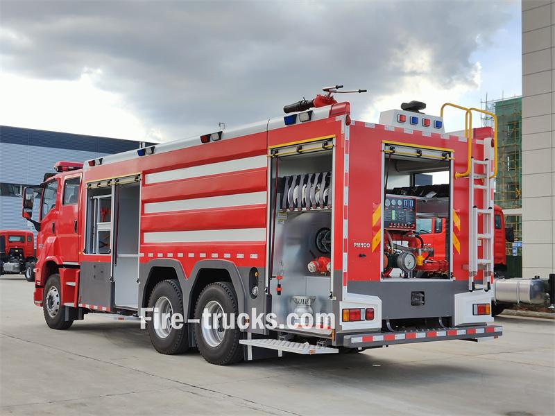 Das Isuzu GIGA 6x4 Schaumlöschfahrzeug mit 10 Kubikmetern Fassungsvermögen basiert auf dem Isuzu GIGA 6x4-Fahrgestell mit einem Radstand von 4600 mm + 1370 mm. Es ist mit einem Isuzu 6UZ1-TCG61-Motor und einem 12-Gang-Automatikgetriebe ausgestattet. Im vorderen Teil des Aufbaus befindet sich der Geräteraum, im mittleren Teil ein 8500-Liter-Wassertank aus Kohlenstoffstahl und ein 1500-Liter-Schaummitteltank aus Edelstahl. Im hinteren Teil ist der Pumpenraum untergebracht, der mit einer CB10/60-XZ-Feuerlöschpumpe, einem Bedienfeld, Feuerwehrschläuchen, Löschgeräten usw. ausgestattet ist. Auf dem Dach befindet sich ein PL8/48-Löschmonitor.