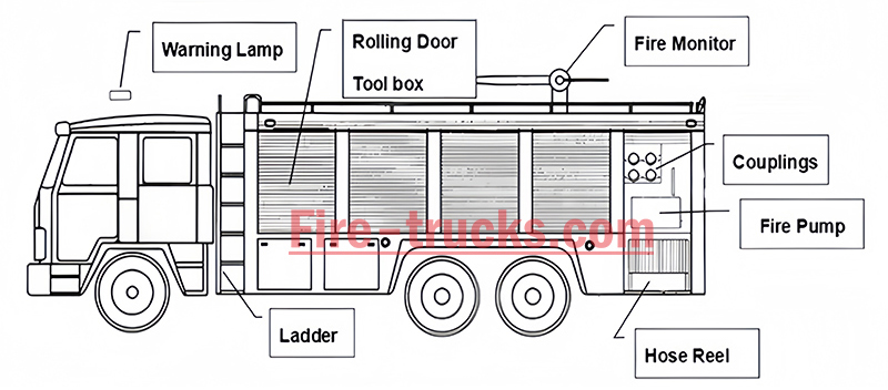• Geräteraum: Dieser Raum befindet sich im vorderen Bereich des Fahrzeugaufbaus und ist mit Ausrüstungsgestellen und ausziehbaren Hängeregalen ausgestattet. Die Gestelle sind logisch angeordnet und bieten eine übersichtliche Aufbewahrung verschiedener Feuerwehrausrüstung (Feuerwehranzüge, Löschdecken, Schlauchhüllen, Feuerbrücken, Feuerlöscher usw.). Die ausziehbaren Hängeregale ermöglichen einen schnellen und einfachen Zugriff auf häufig benötigte Ausrüstung wie Feuerwehräxte, Spitzhacken, Schaufeln, Schraubenschlüssel, Hämmer und Brecheisen und verbessern so die Effizienz der Rettungsmaßnahmen.